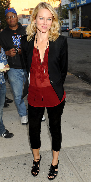Whilst attending the N.Y.C studios for The Daily Show with Jon Stewart last week, Watts wore a mélange of fabrics and style mishaps. The Coach cut out sandals are stunning, don’t get us wrong, but when teamed with black suede three-quarter length pants, we have to wonder how Naomi’s trail of thought works.