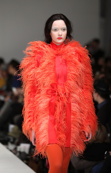 Sheer floor length lace dresses were broken up with industrial zips and skinny black belts. Main features included part-peplum dresses that gave the illusion of half of another garment to the bold coloured cocktail dresses underneath. The feathered pieces whipped the audience into a frenzy as they floated down in bright fuchsia pinks and solid blacks.