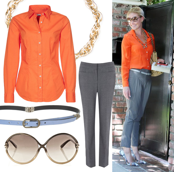 We love how she brightened up her chic, smart grey trousers with an orange blouse and also added some hot accessories such as a chain necklace, skinny belt and massive sunglasses. When in LA…