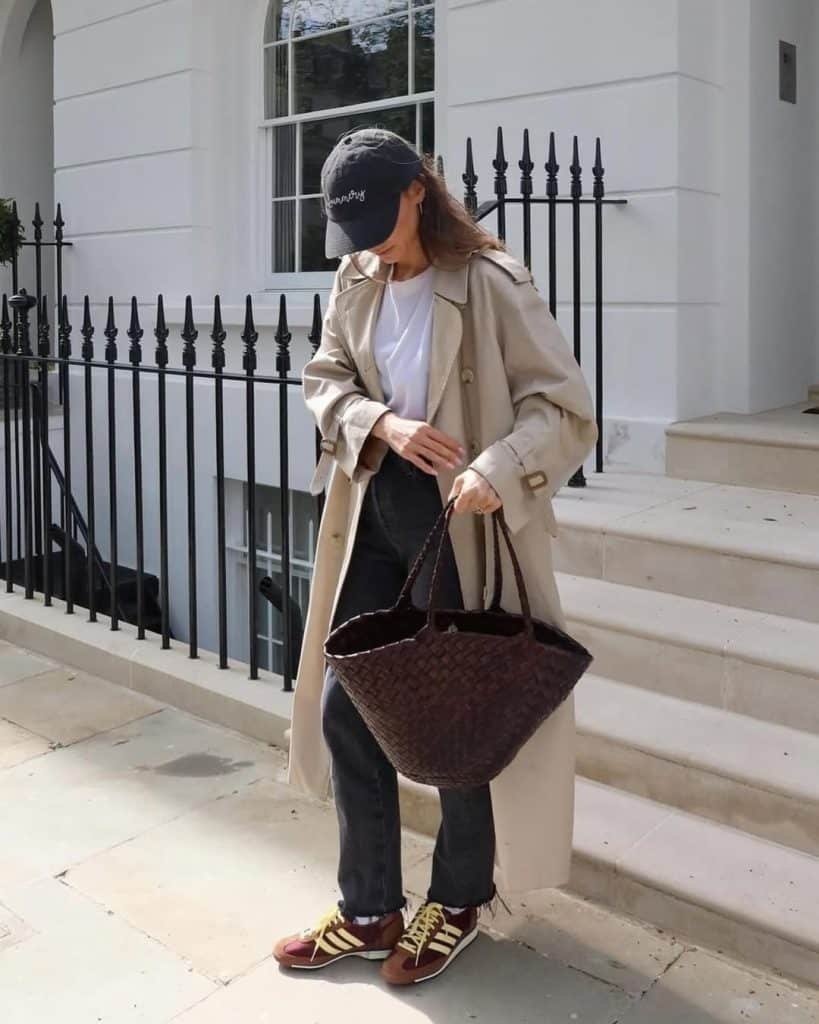 Trench Coat + Straight Jeans + Adidas Sneakers