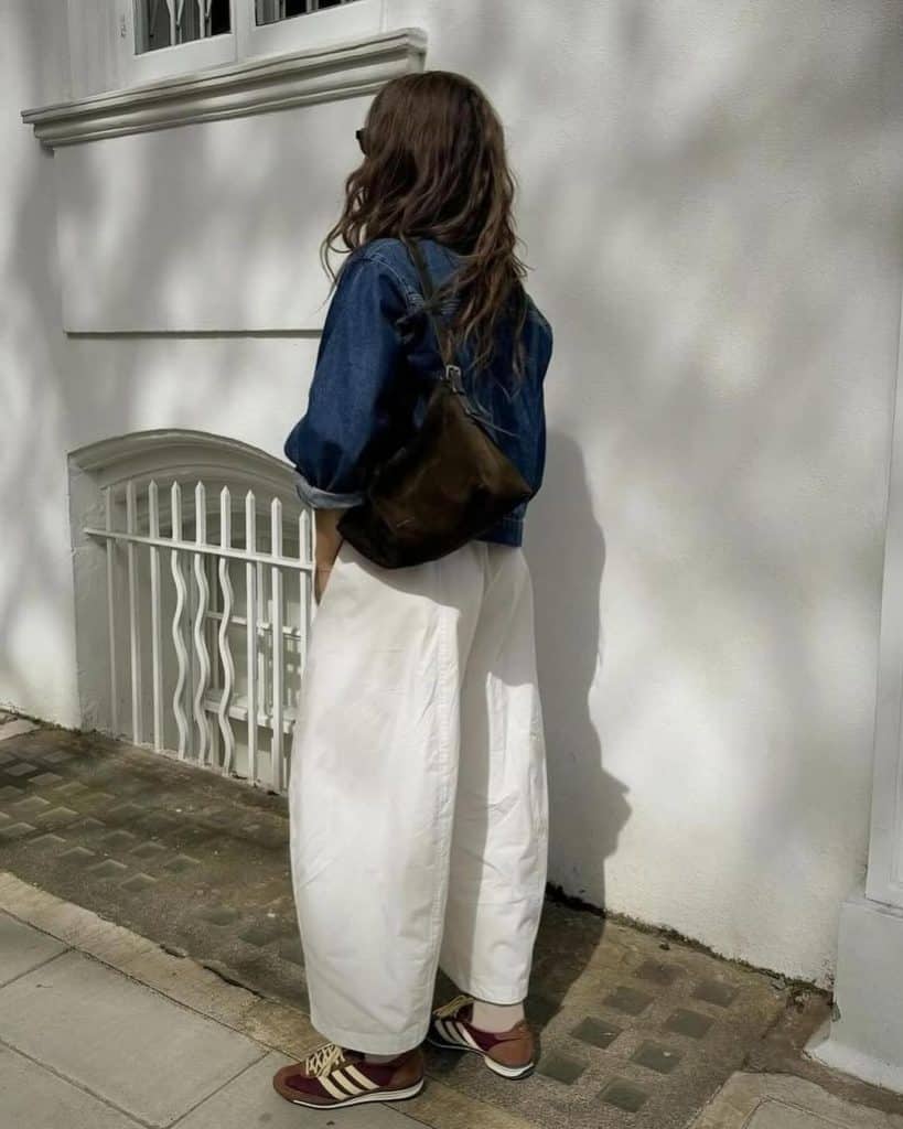 For a relaxed yet put-together look, style your Adidas Sambas with wide-leg white trousers and an oversized pastel sweater.