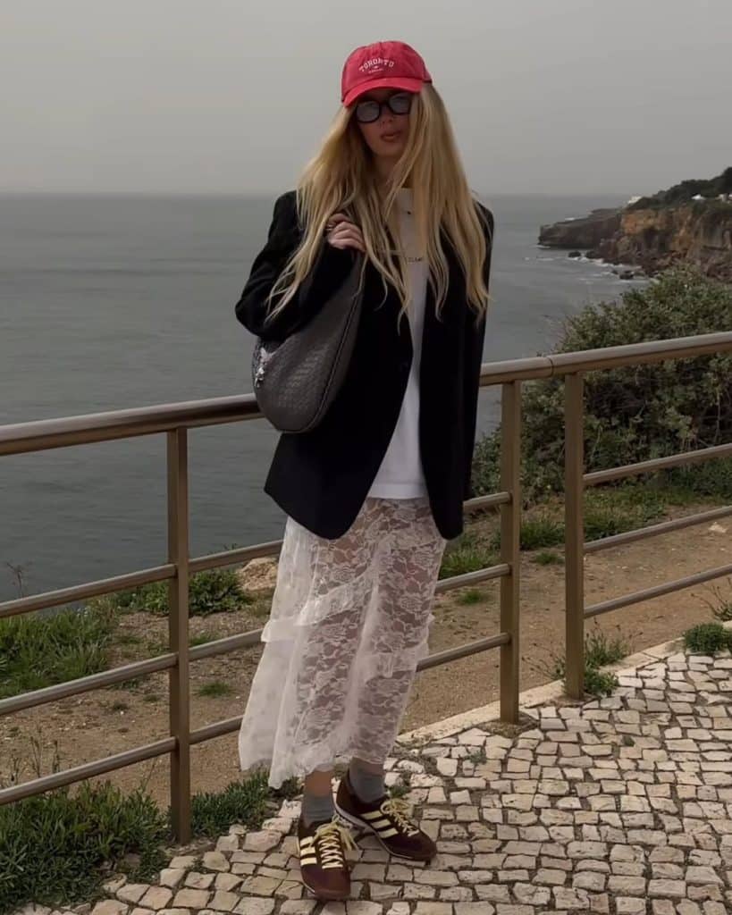 Oversized Blazer + Lace Skirt + Adidas Sneakers