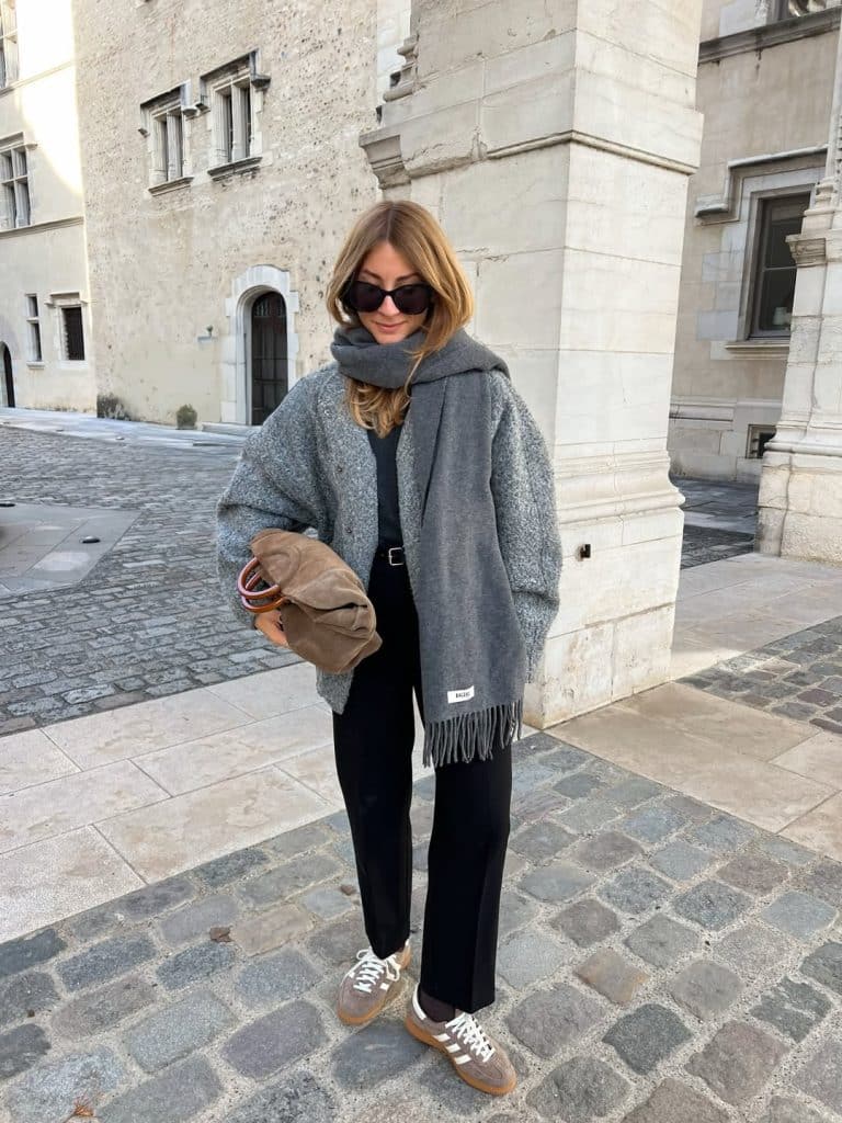 The scarf adds texture, while Adidas sneakers keep the look grounded and practical.