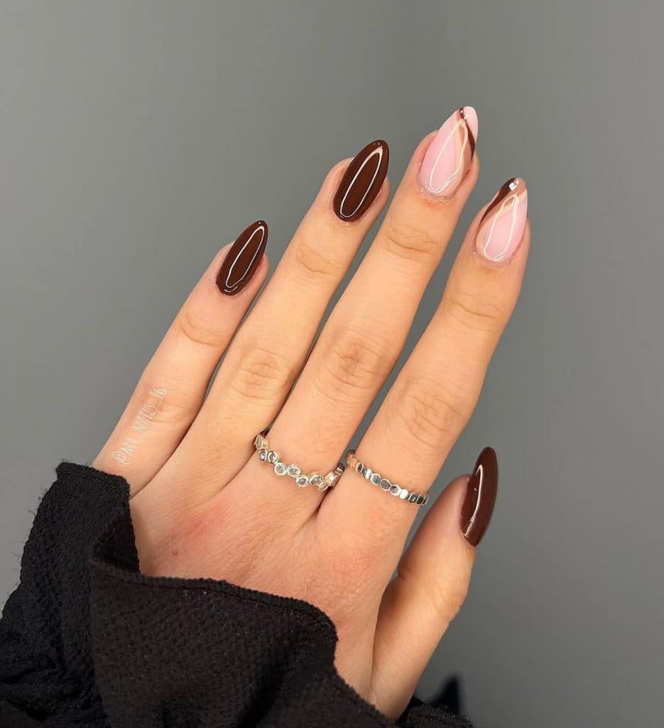 Think rich, glossy chocolate brown nails paired with negative space and swirly line art on two accent fingers.