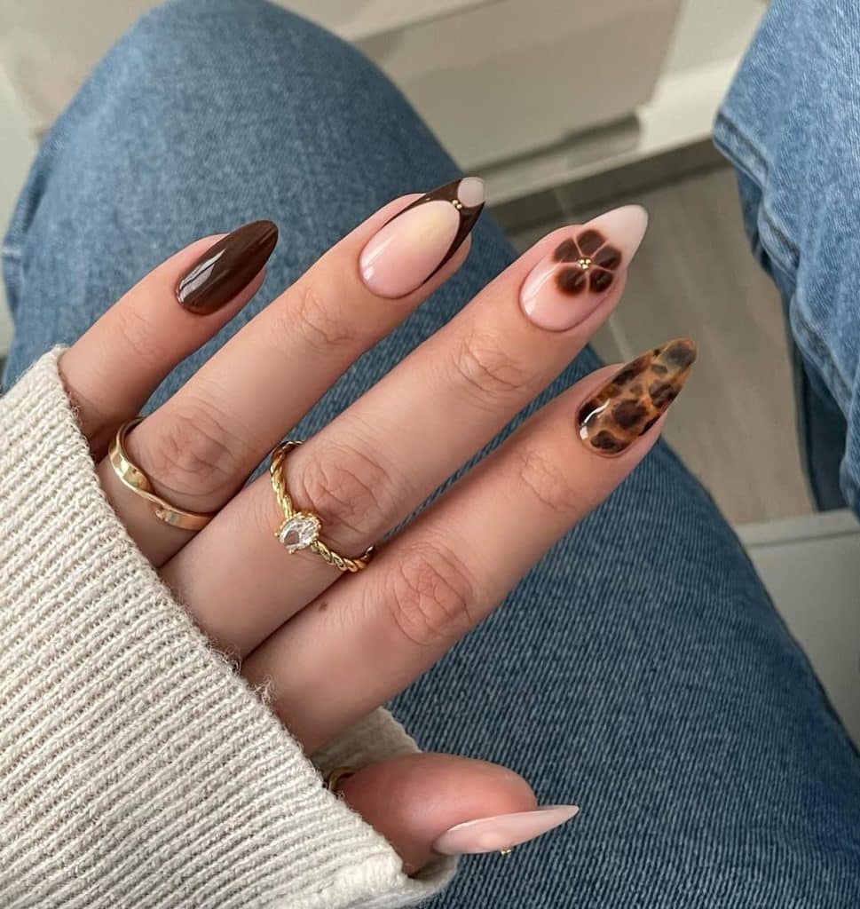 If you’re a brown lover at heart, this one’s for you. It’s the ultimate mix-and-match design, a glossy chocolate nail here, a chic tortoise accent there, maybe a soft ombré and even a little flower design.