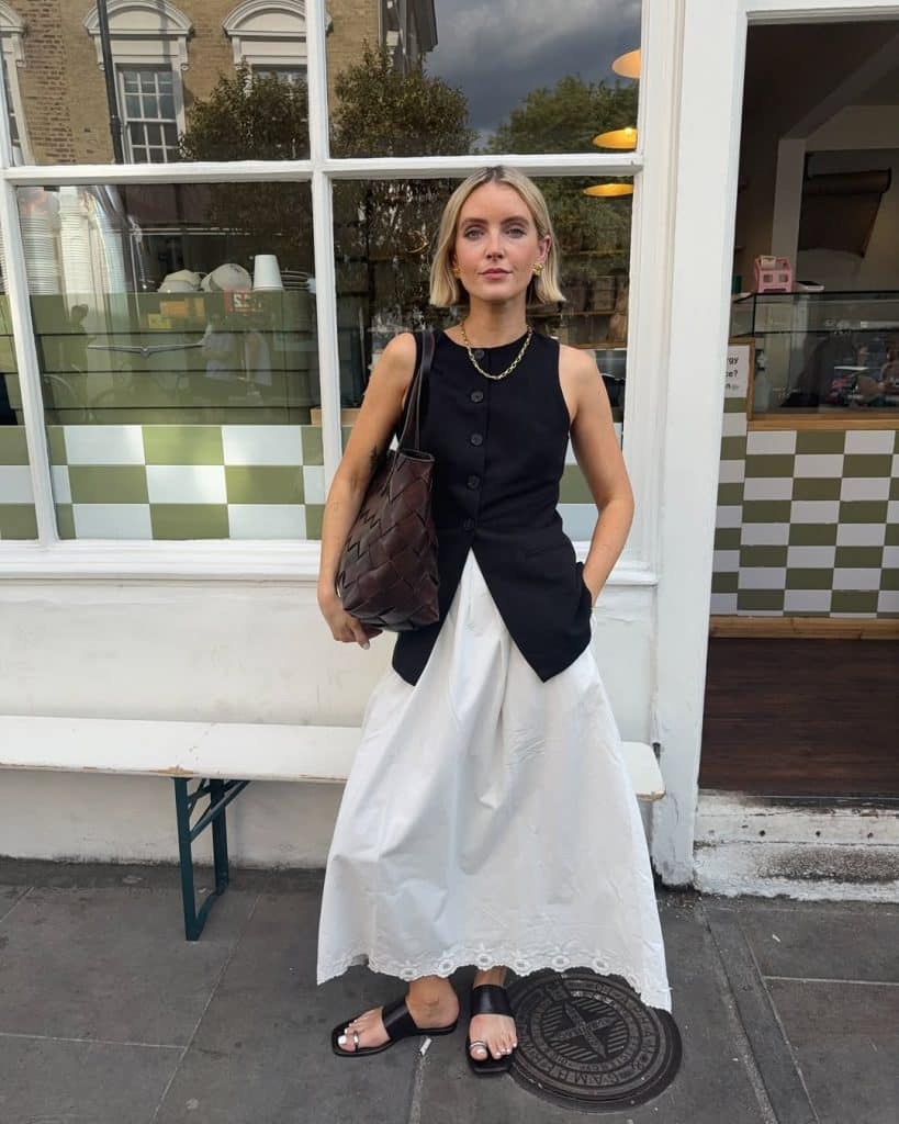 There’s beauty in simplicity. A white sundress, leather sandals, and a straw bag. That’s all you need. You’ll look chic, effortless, and timeless.