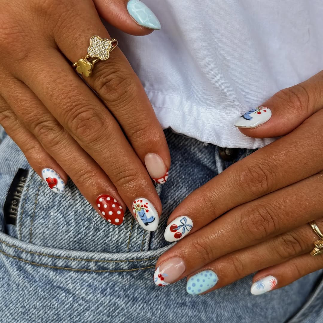 Each nail tells a slightly different story, but they all speak the same language: bold red, crisp white, vivid blue, and just the right splash of nude to ground the whole thing.