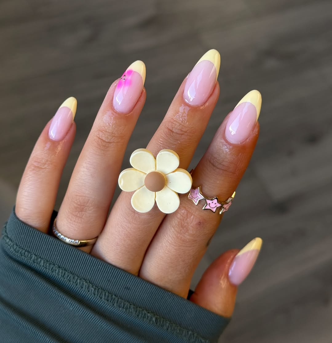 The lemony yellow tips are soft, sunny perfection. But the magic is in those three middle nails — covered in bold, funky flowers in hot pink, peach, and fuchsia.