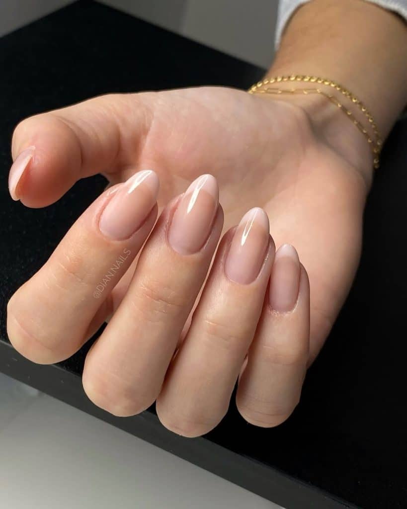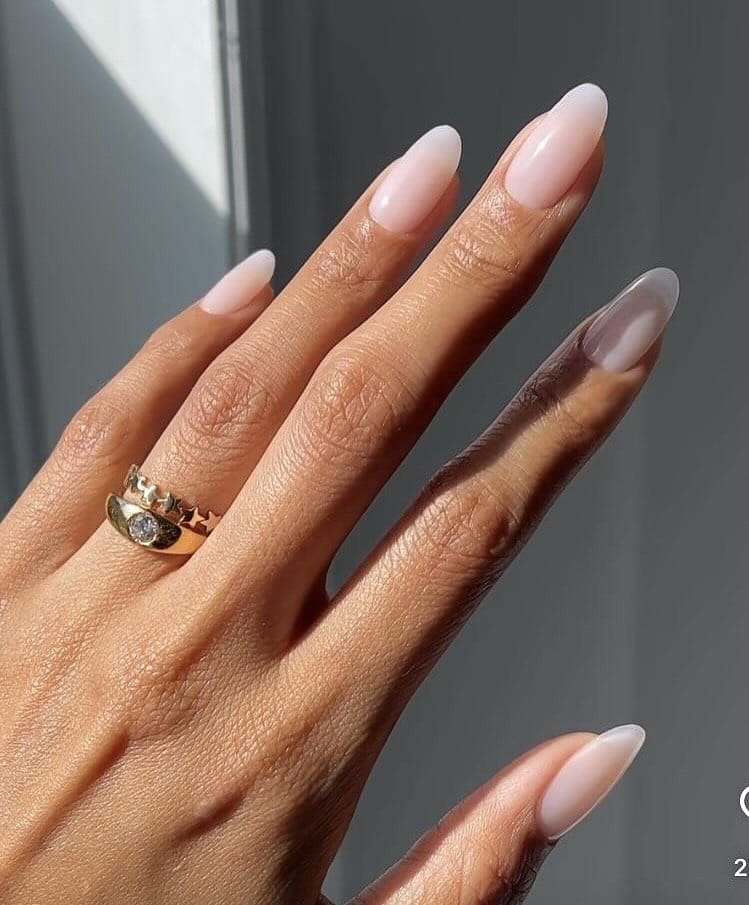 The classic French manicure gets a modern, almond-shaped upgrade here.