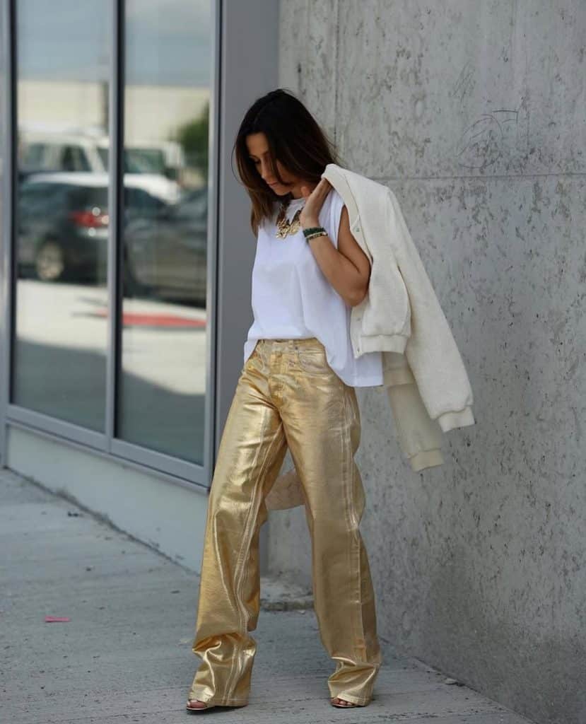 This one’s for the girls who want to shine, literally. Gold trousers are bold, no doubt about it.