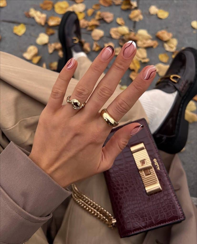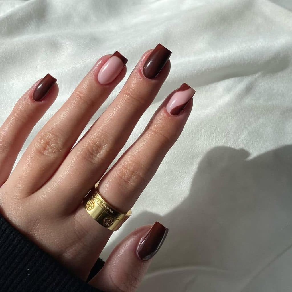 Soft pink and warm brown split each squared nail right down the middle. The result? Symmetry, comfort, and a mani that’s basically fall in a bottle.