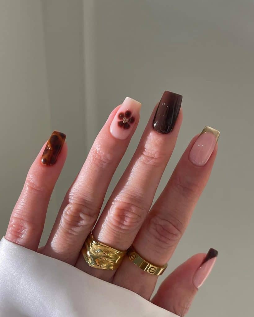 Each nail tells a story here. A tortoiseshell accent, a delicate floral detail, rich browns, glossy tips, it’s the mix-and-match fall fantasy you didn’t know you needed. Cozy, artsy, and totally charming.