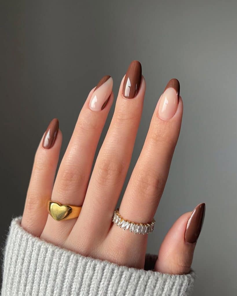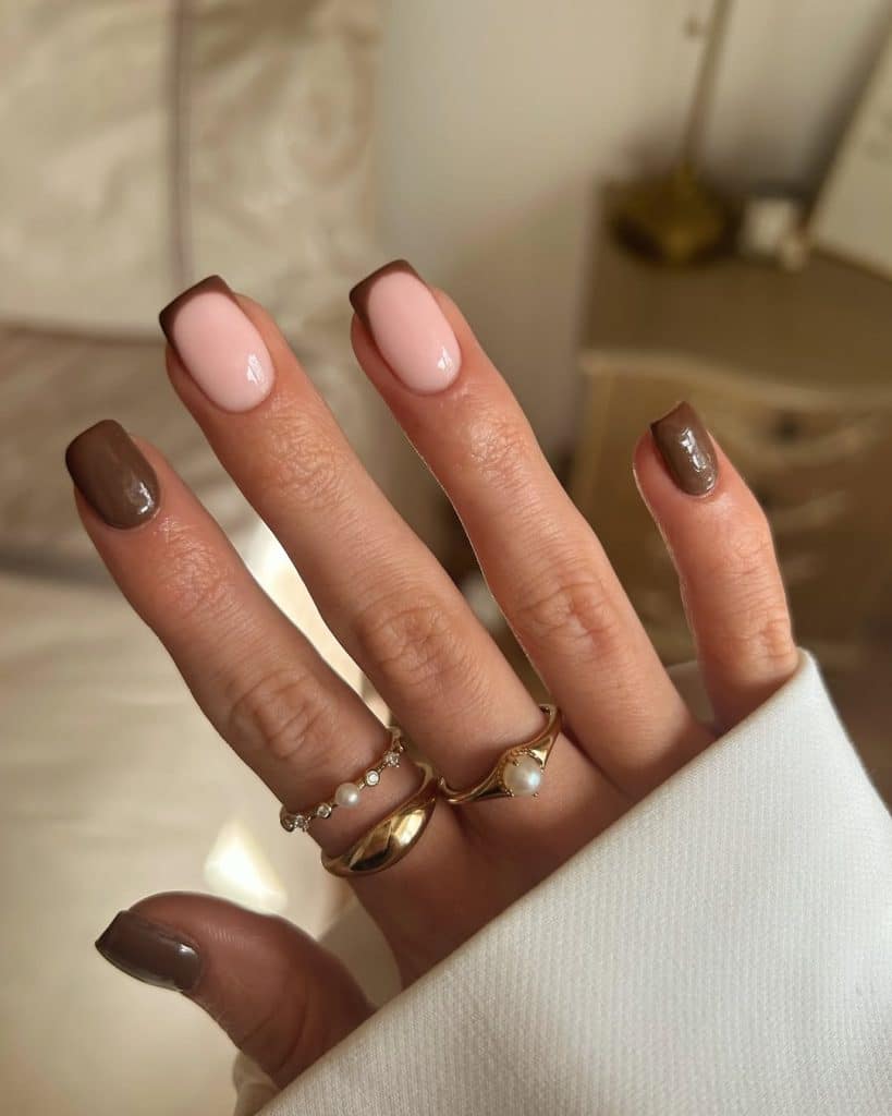 This mani mixes full-color nails with soft French tips in chocolate and blush.