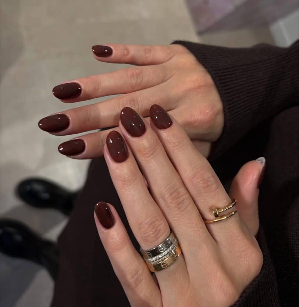 A glossy wine red never fails. Oval-shaped nails dipped in cabernet bring all the fall romance.