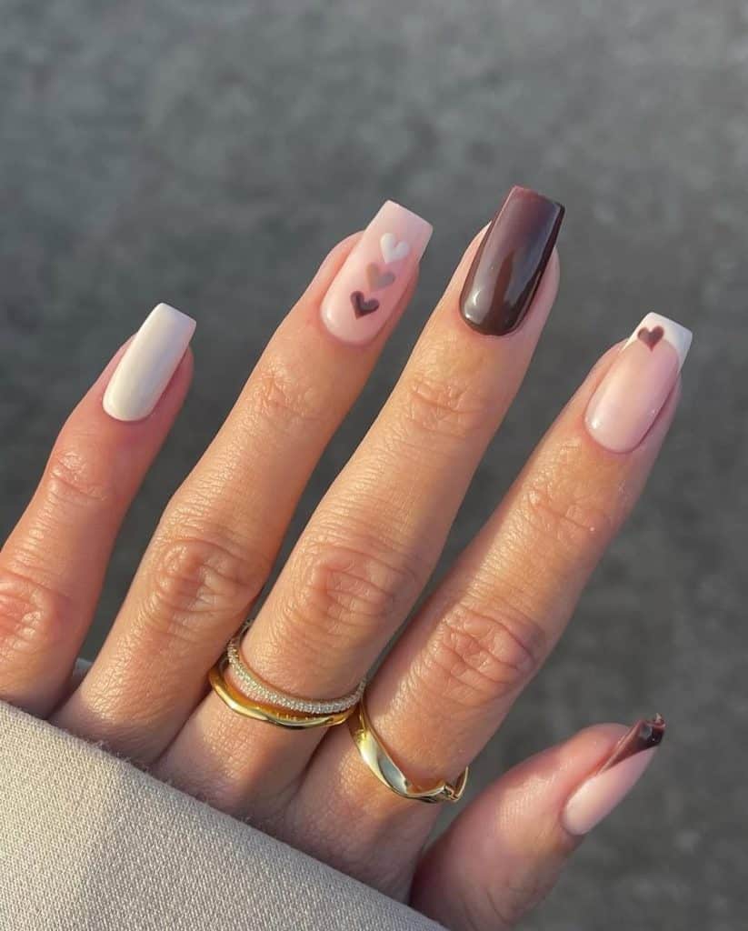 Think hearts and warm tones, soft browns, creamy neutrals, and marbled accents. This square-tipped set is sweet without being syrupy.