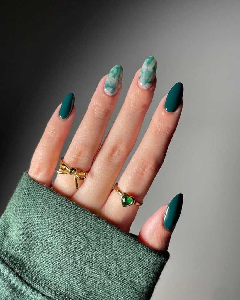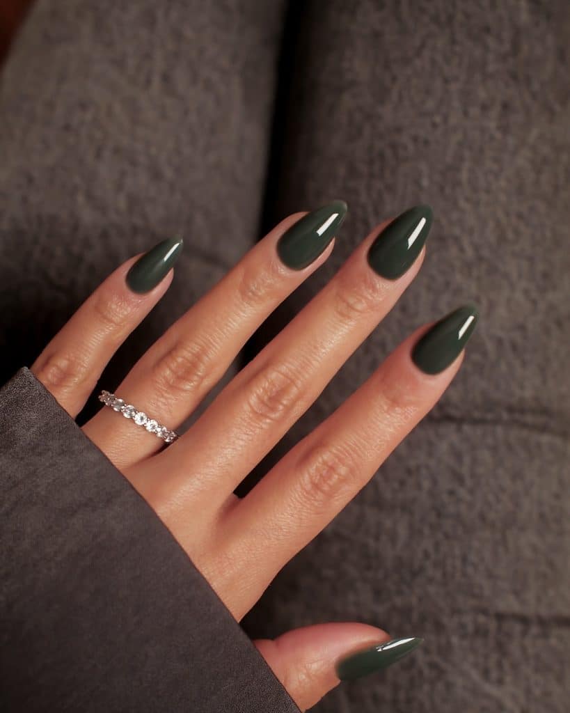 Velvety forest green on almond nails brings all the drama, in the best way.