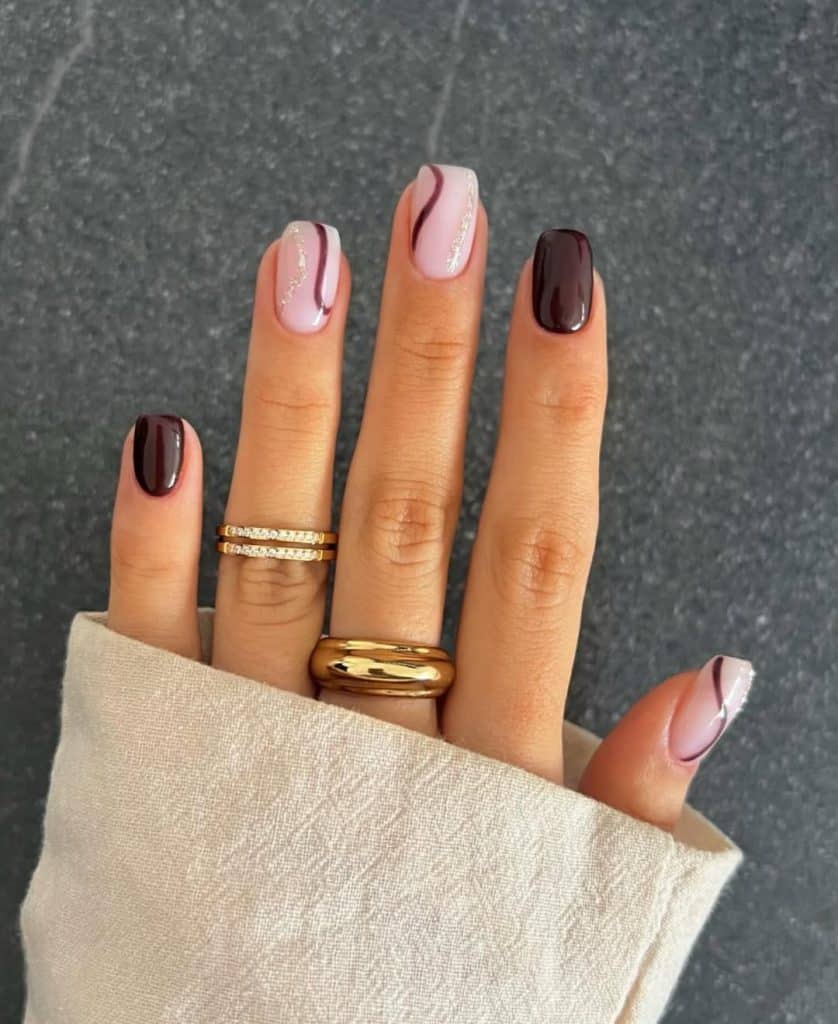 Two words: cozy glam. This mani marries deep mocha tones with nude swirls and a dusting of glitter that catches the light just right. It’s like your morning latte got a little festive.