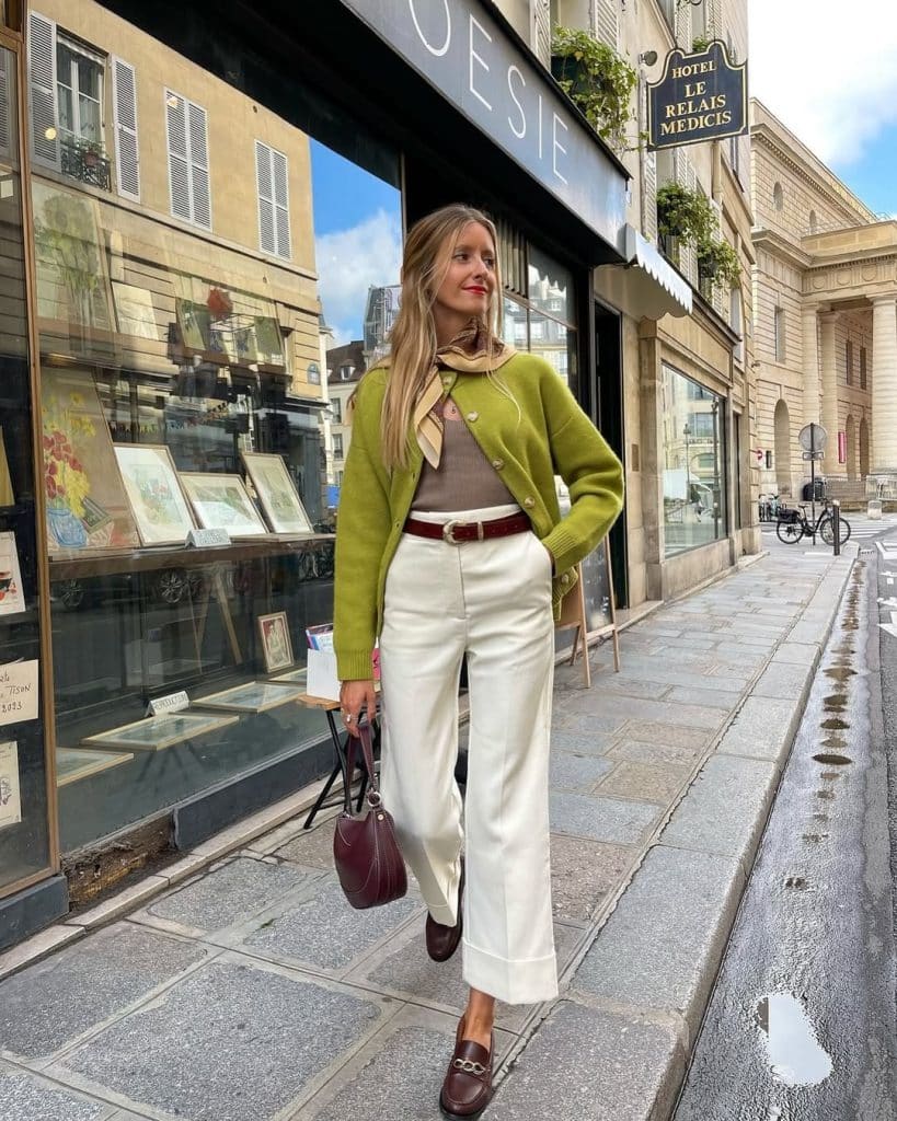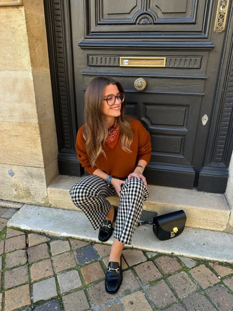 This style works beautifully with simple sweaters or blouses, it instantly adds polish, personality, and a pop of color without any extra effort.