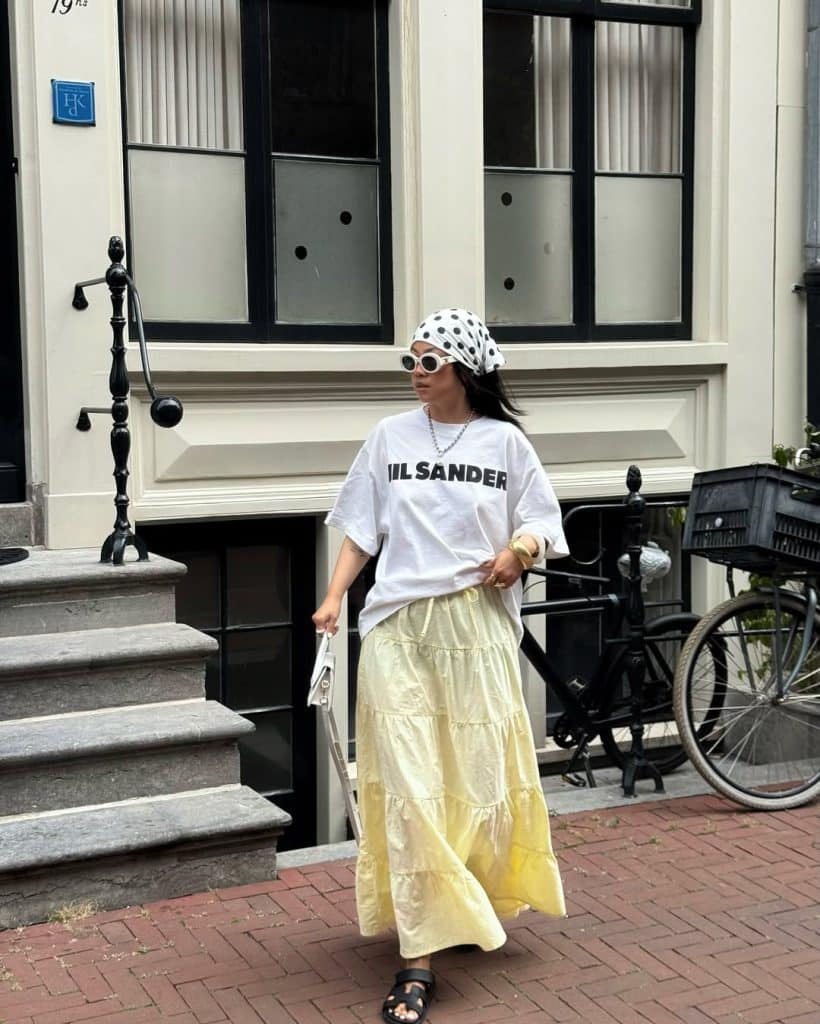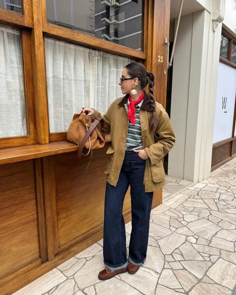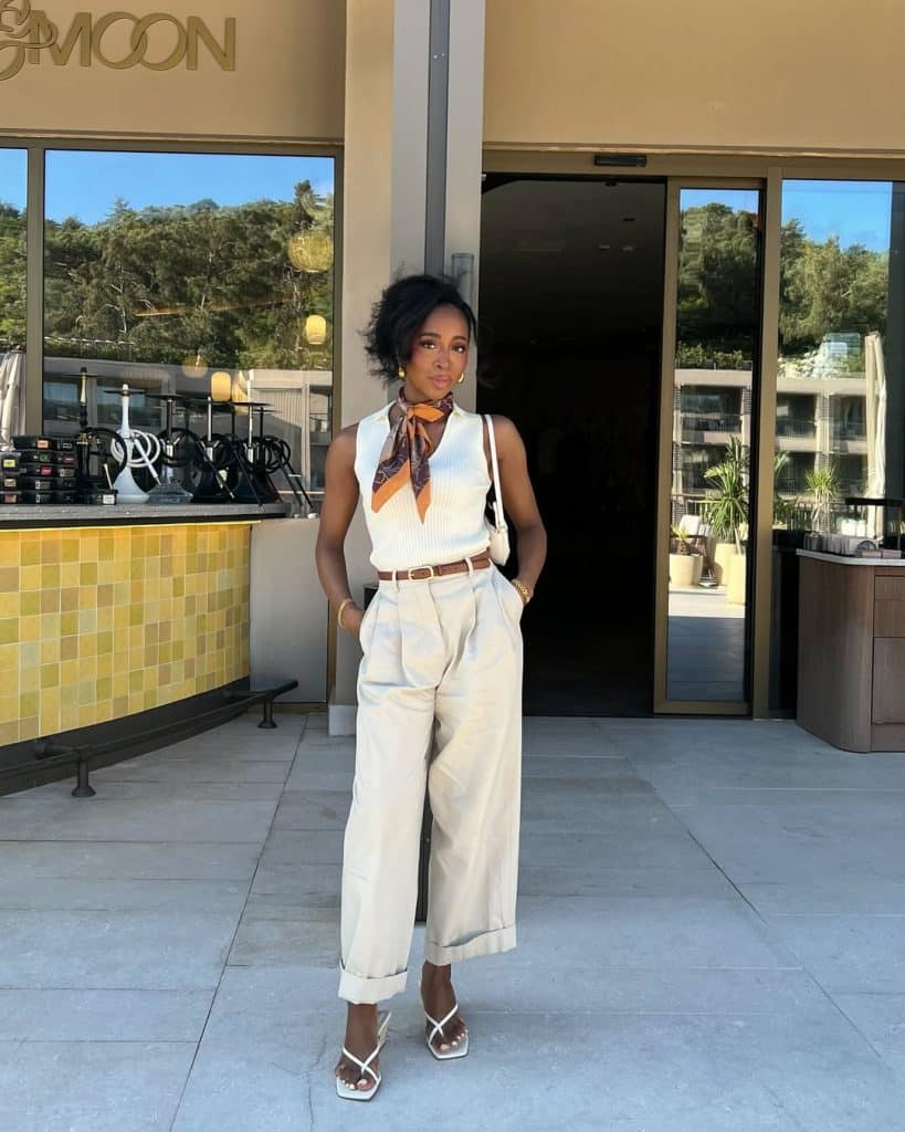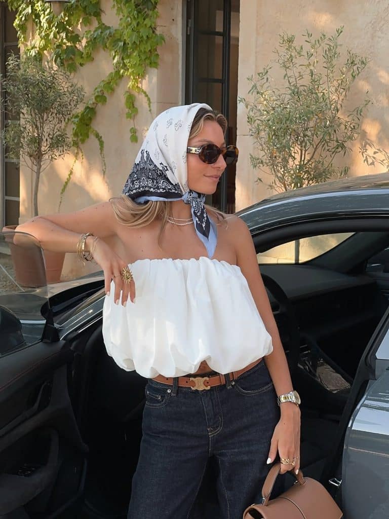 For that relaxed, effortlessly cool vibe, try styling your scarf like this with a simple bandana knot.