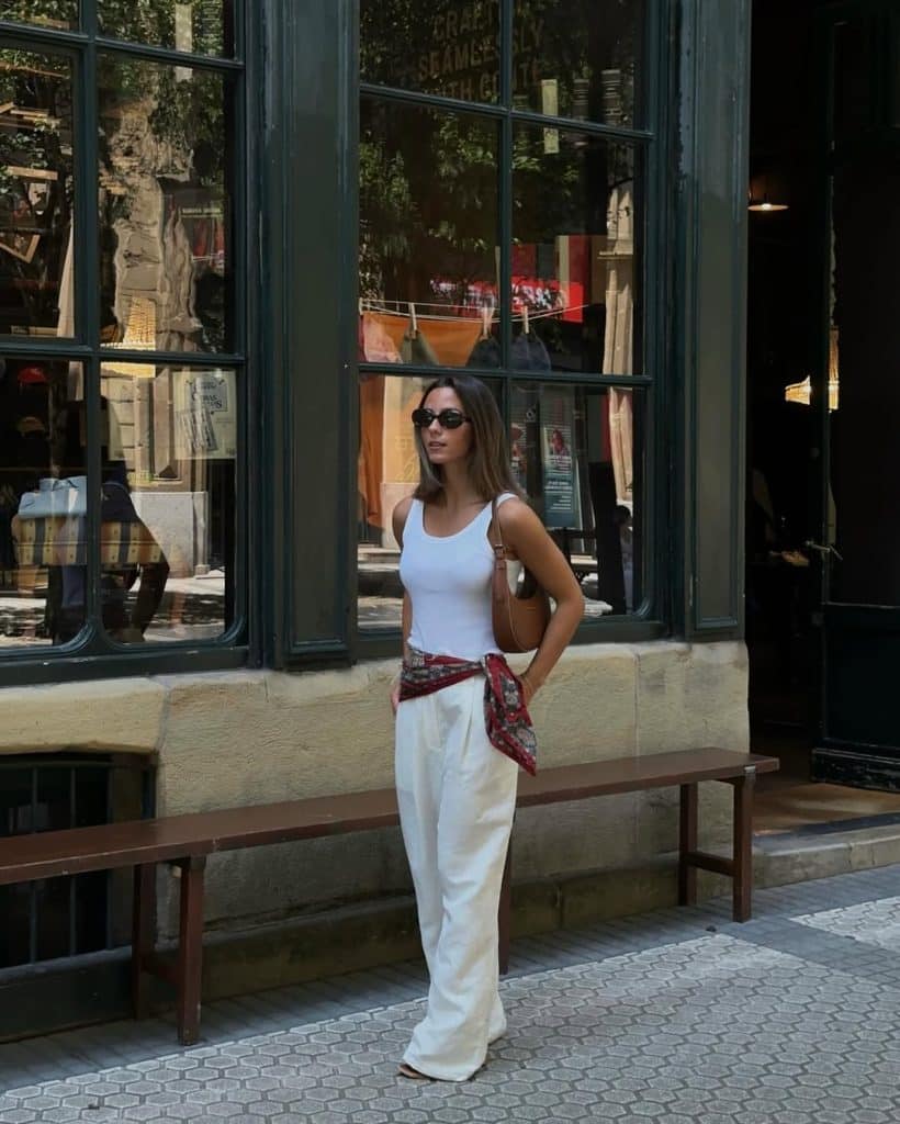 Choose a slightly longer scarf, nothing too bulky and wrap it around your waist. You can tie it in a knot off to the side or let it hang loosely for a more relaxed feel.