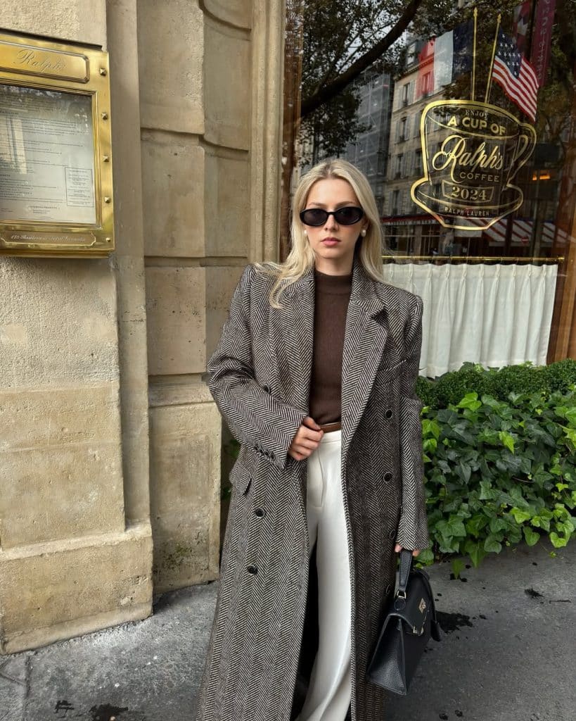 Let’s start with the ultimate fall investment piece: a long herringbone coat.