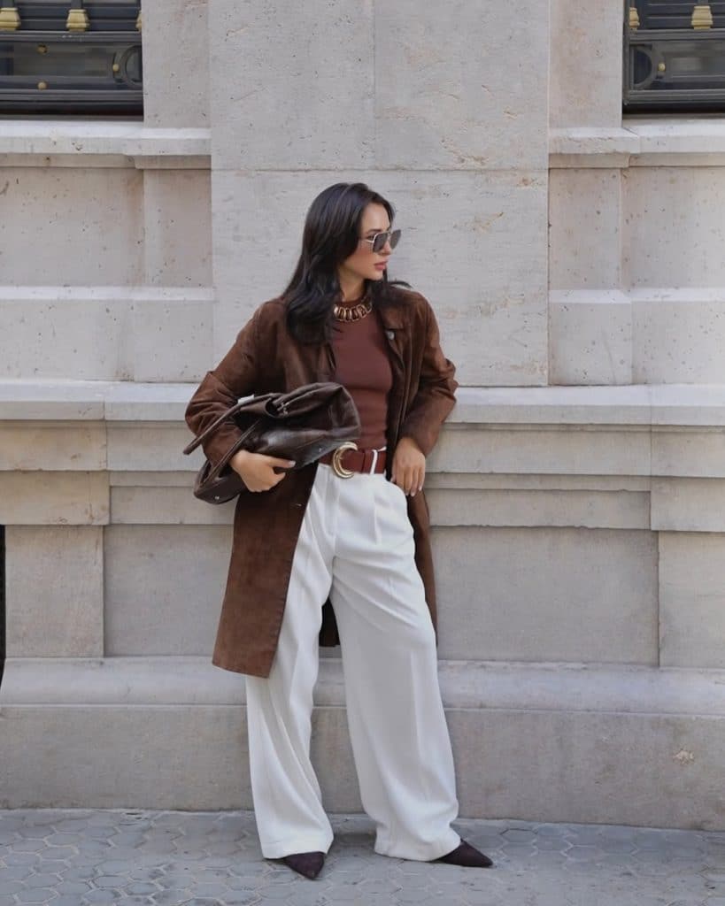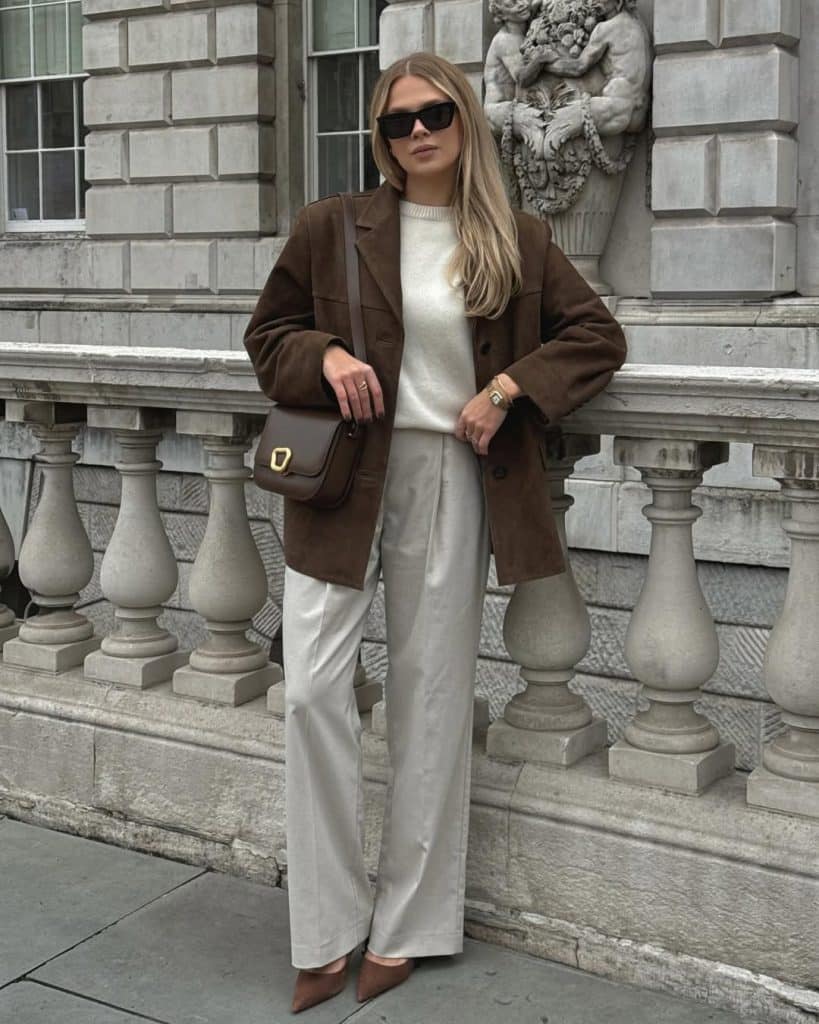 A soft brown suede blazer over ivory trousers and a simple sweater is the epitome of understated chic.