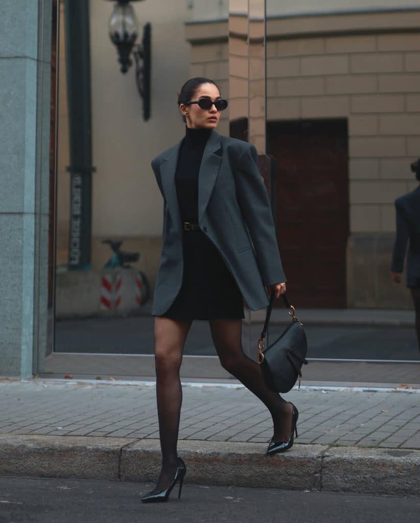 Picture it: a charcoal or grey blazer, paired with a black turtleneck and black mini skirt.