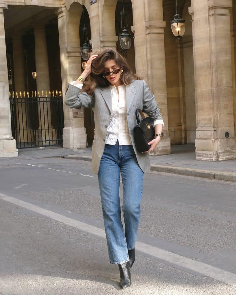 Take a sharp gray blazer and wear it with a crisp blouse and straight-leg jeans.