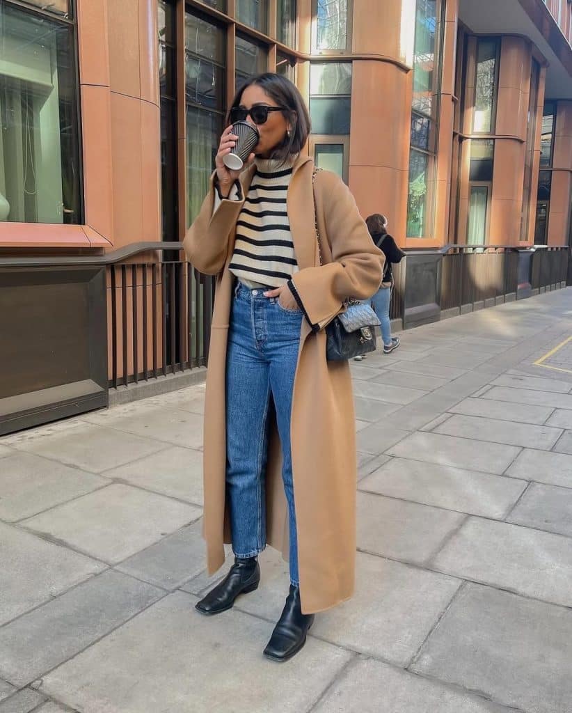 That striped sweater and camel coat combination? It’s an absolute brunch classic.