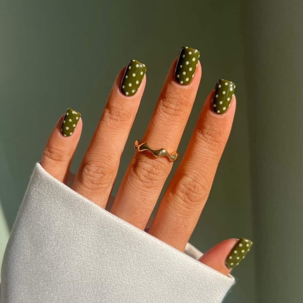 These olive green nails dotted with pale sage accents feel warm and grounded yet fresh and fashion-forward.