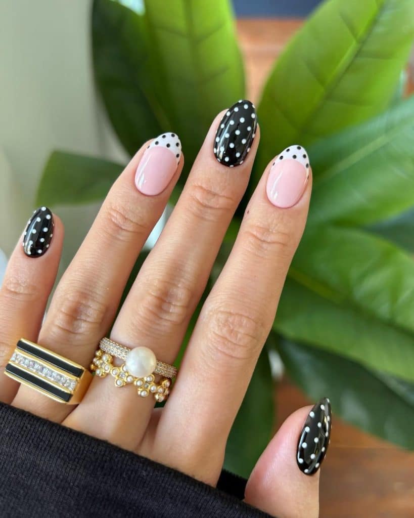 Imagine glossy black nails punctuated with crisp white dots, or reverse it for a fun twist.