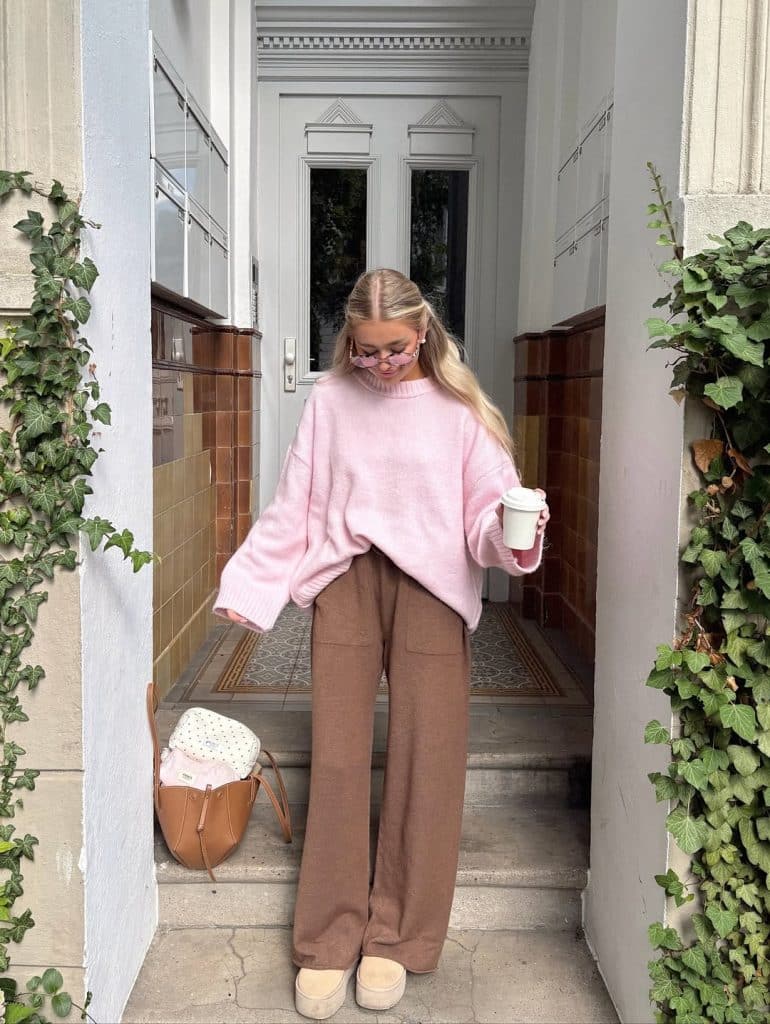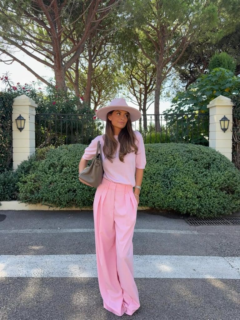 Think about a pair of wide-leg pink trousers worn with a matching sweater or blouse.