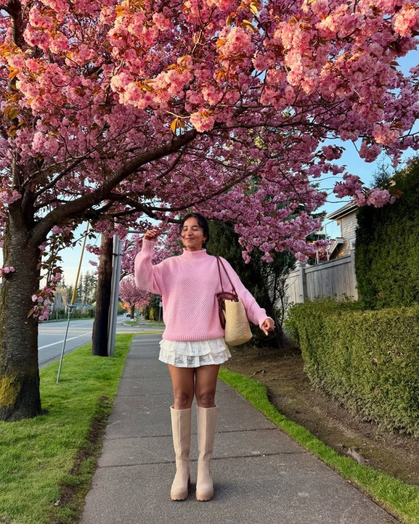 A tweed mini skirt in blush pink feels expensive, almost like something you’d find in a high-end boutique.