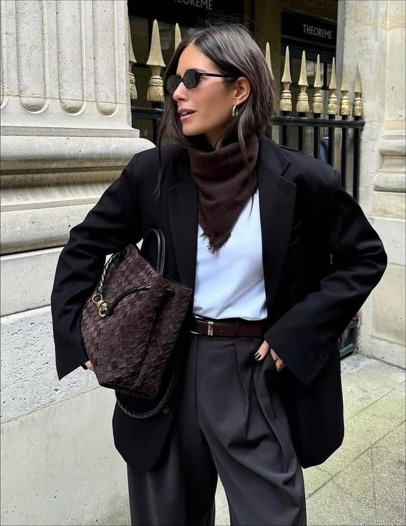 Black blazer. White tee. Dark scarf. Tailored trousers.