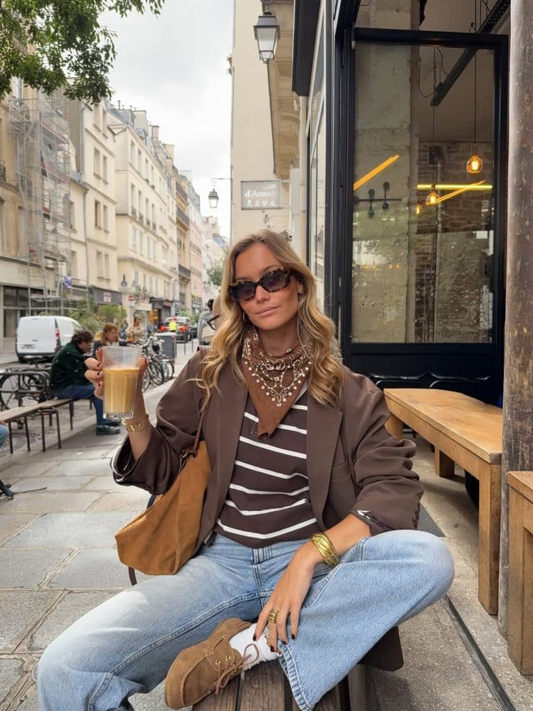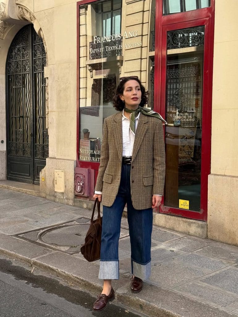 A checked blazer. Cuffed jeans. Loafers. Silk scarf tied neatly at the neck.