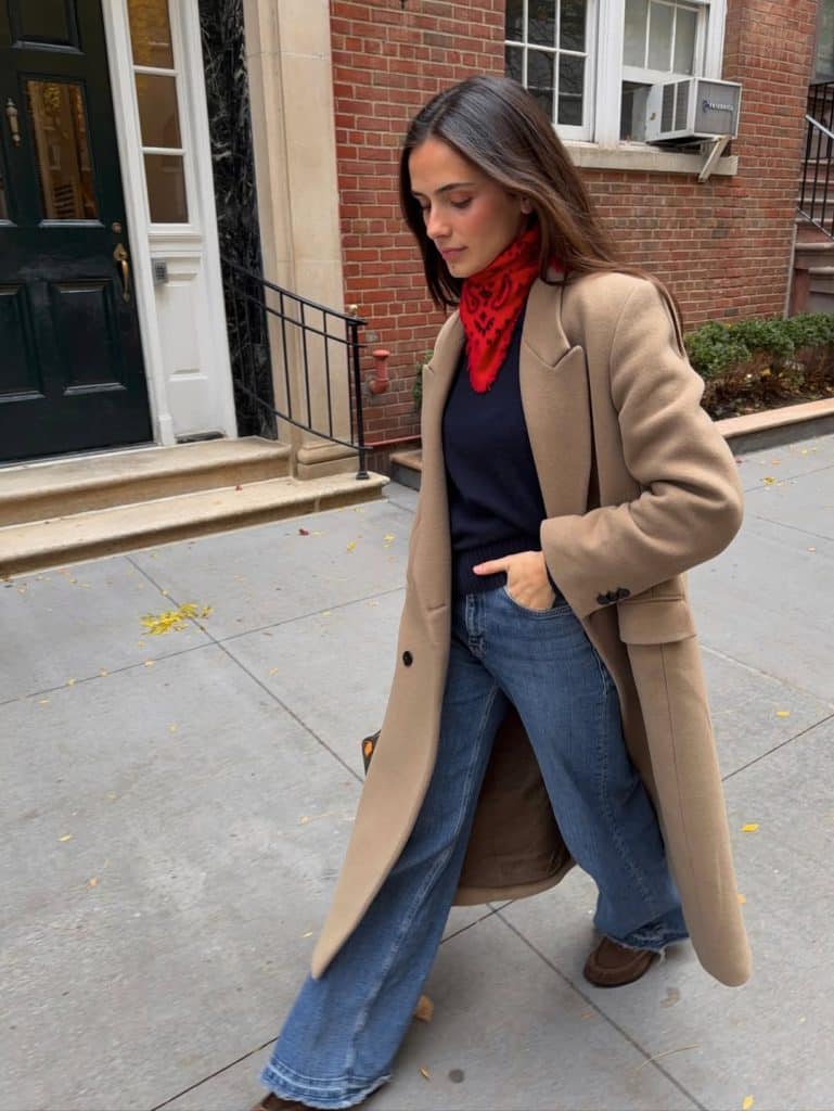 This is style minimalism at its peak, clean lines, smart choices, and a scarf that pulls the entire look together.