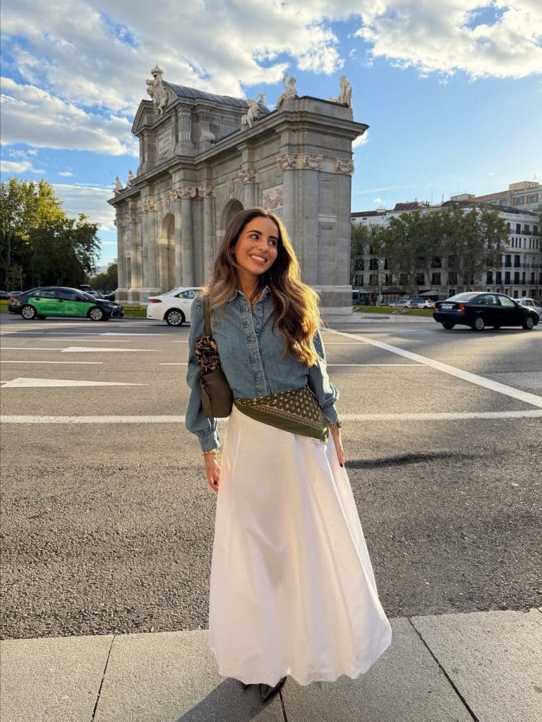 Pair a denim shirt with a long skirt, then wrap a scarf around your waist like a belt or knot it at your hip.
