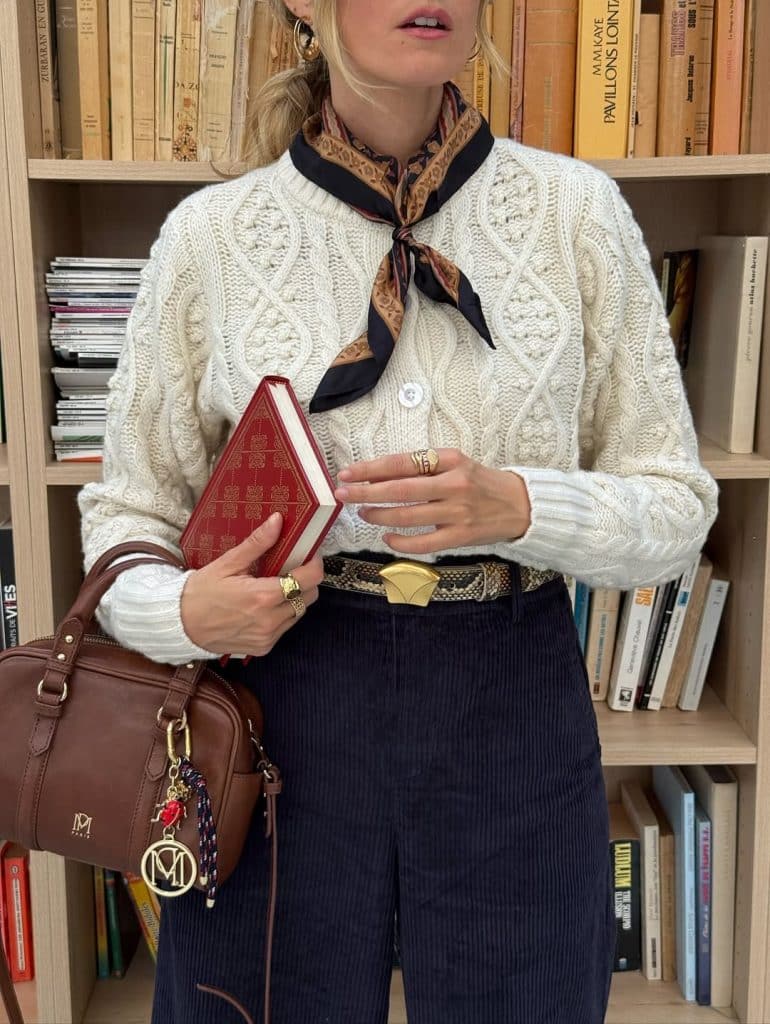Picture this: a cozy cable-knit sweater that feels like a hug, paired with tailored trousers and a silk scarf tied into a delicate bow.