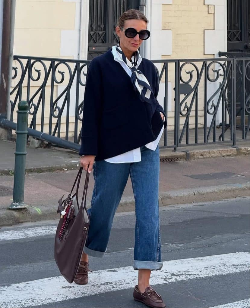Rolled denim, polished loafers, a crisp shirt, and a silk scarf tied loosely at the neck.