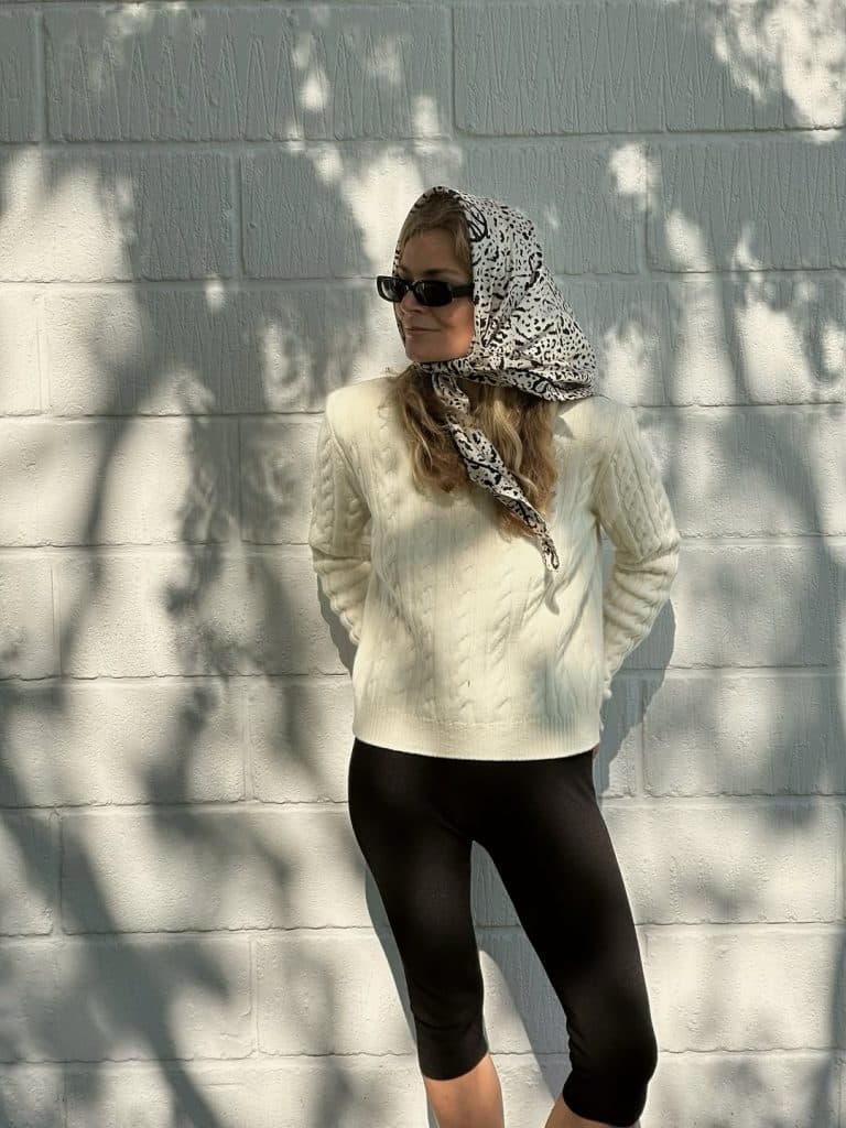 Wrap a scarf around your head and pair it with knits or oversized sunglasses.
