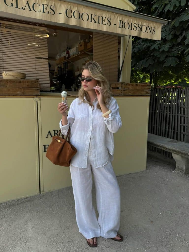 An oversized white linen shirt and matching wide-leg pants forms a breathable, relaxed silhouette that embodies quiet luxury.