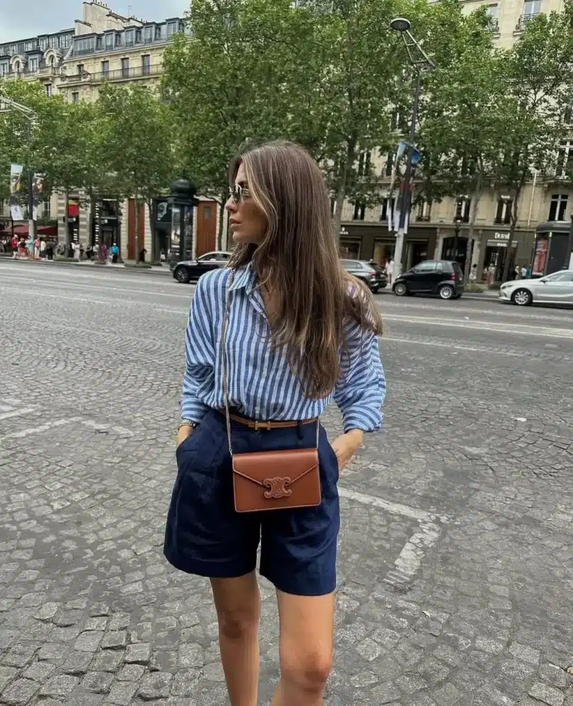 A crisp blue striped shirt paired with tailored navy shorts creates a refined preppy palette that never feels dated.