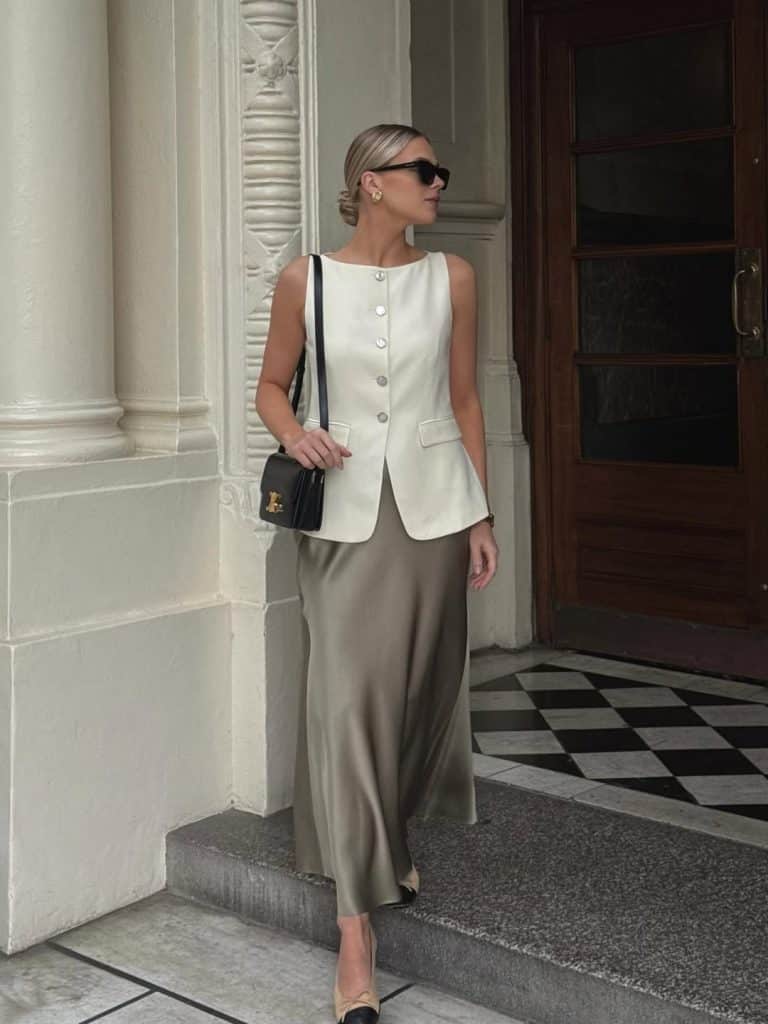A sleeveless cream top provides structure and simplicity, while a fluid silk midi skirt introduces graceful movement that catches the light with every step.
