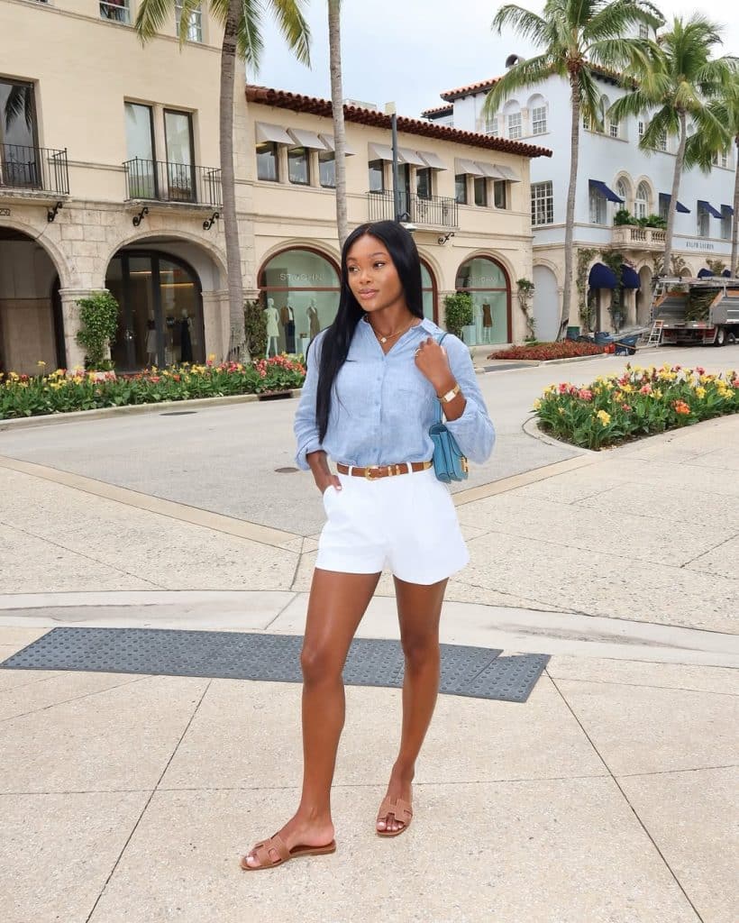 A relaxed blue shirt tucked into tailored white shorts creates a balance between polish and comfort.