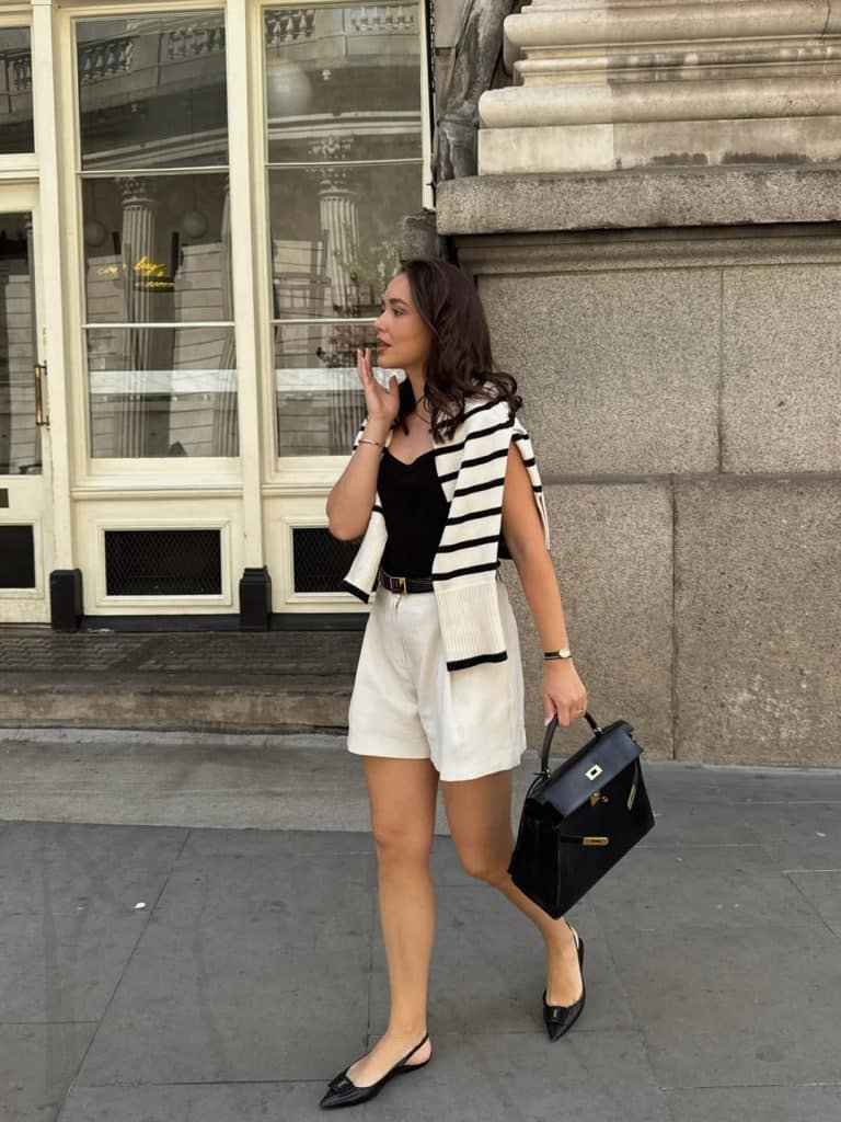 A sleek black camisole forms a minimal base, while structured white shorts add refinement.