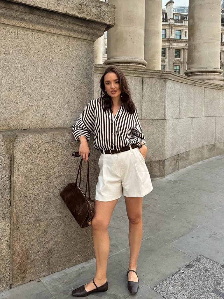 A brown striped shirt tucked into cream pleated shorts creates warmth and depth while remaining soft and understated.