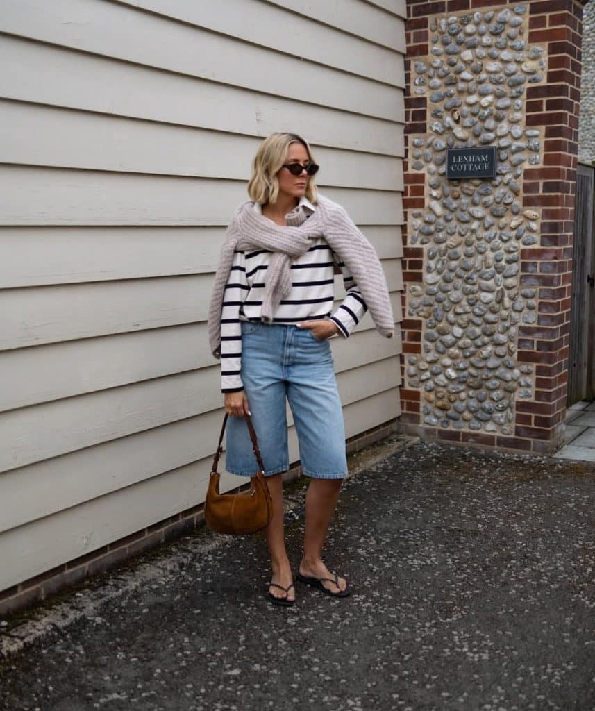 Picture this: tailored light-wash jorts, a classic striped top, and a sweater casually draped over your shoulders (very “I just threw this on” energy).