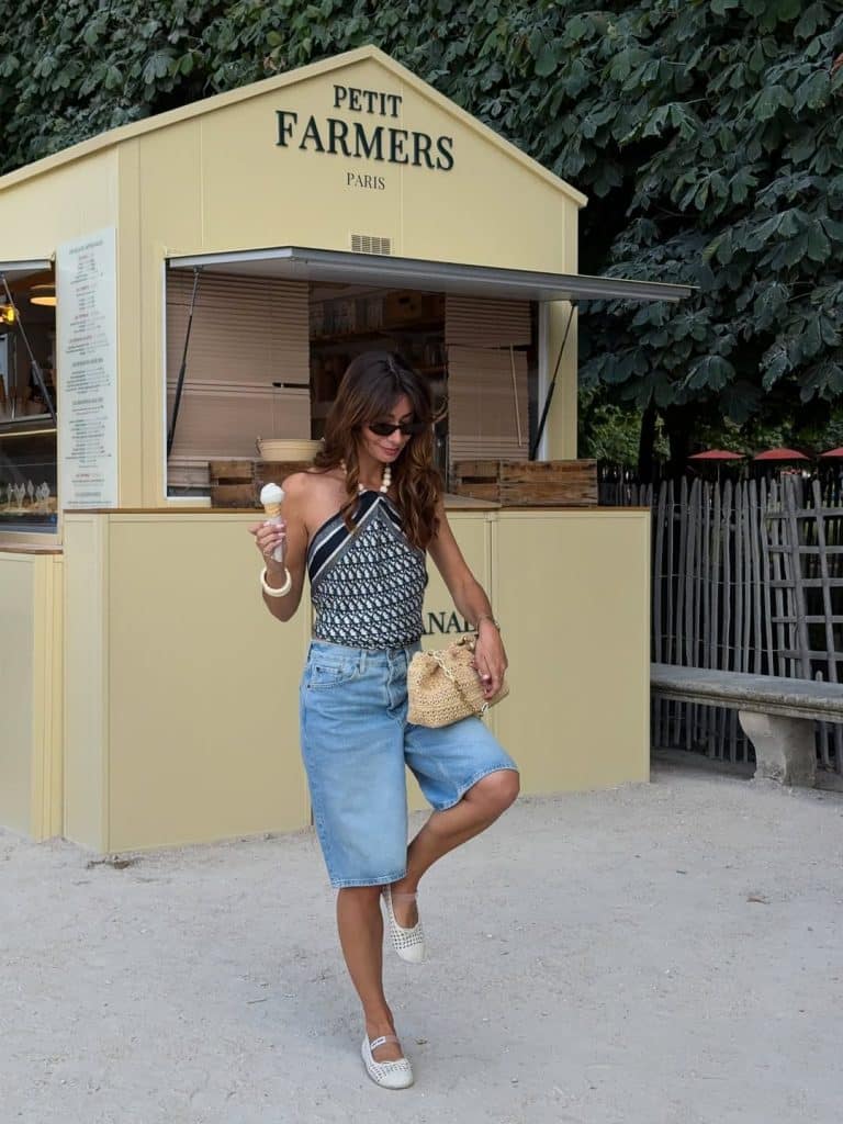 A silk scarf or halter-style top paired with light wash jorts creates that relaxed European summer aesthetic.