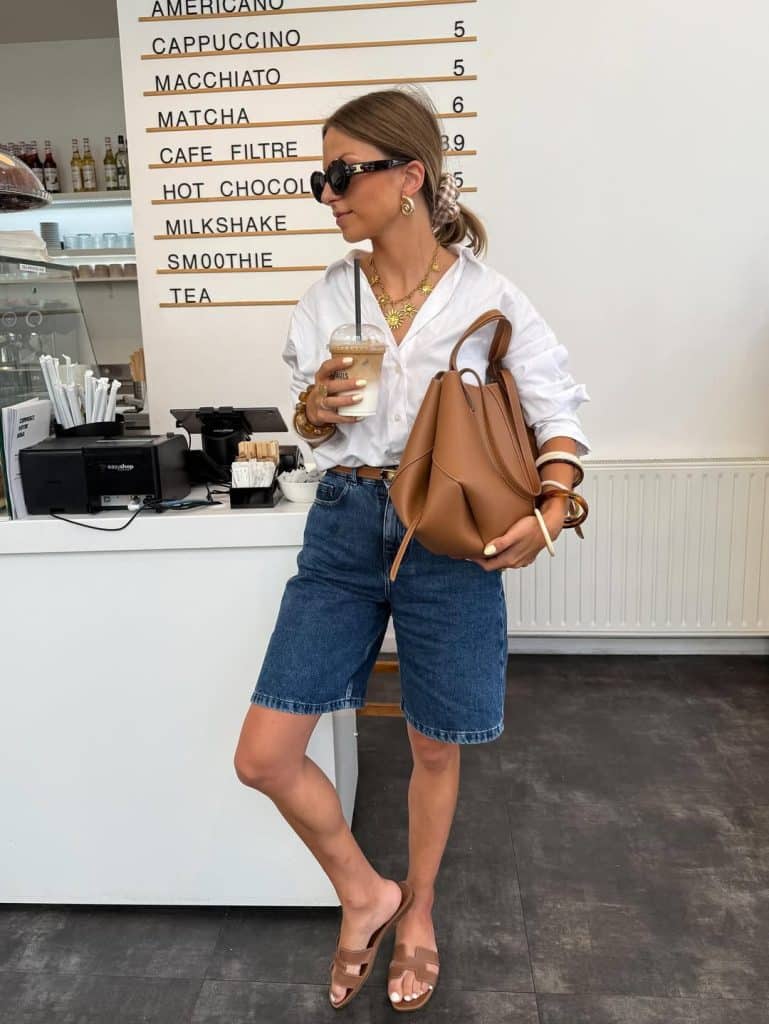 Tuck a slightly oversized shirt into tailored jorts, add a belt, layer some gold jewelry, and you’ve got a smart casual outfit that works almost anywhere.